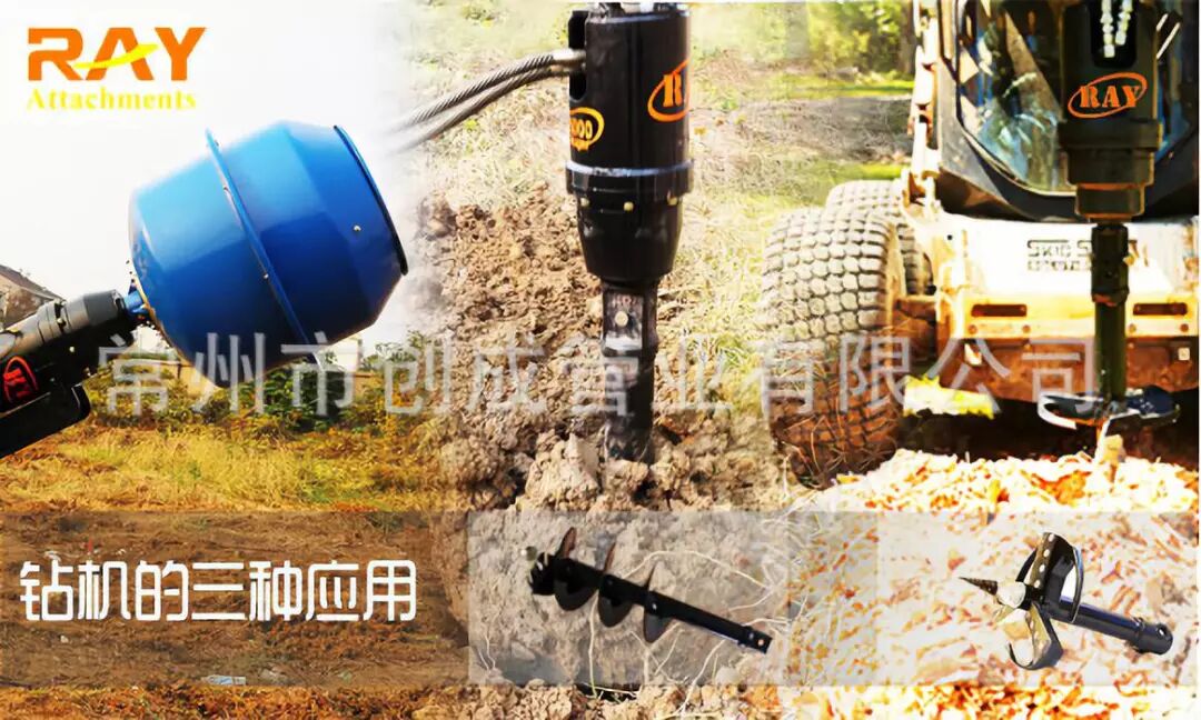 创成雷钻螺旋钻机刨树器可以和各类挖机,滑移装载机吨位相配套。如果你有成孔工程,刨树工程,搅拌水泥工程,那就带着你的挖机来创成预约雷钻为你效力吧。如果是其他工程那就更要来创成选购你中意的其他属具了。